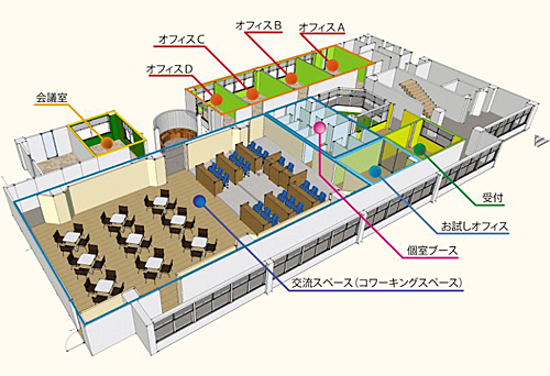 オープン予定の宮古島ICT交流センターは、地域住民や企業などによるコラボレーションの促進やイノベーションの創出を目的としている。床面積787平方メートルで、企業の入居スペースのほか、コワーキングスペース、個室ブース、お試しオフィスコーナーなどを設ける予定だ。