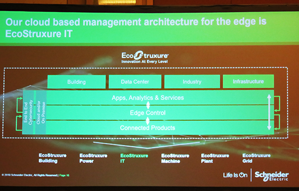 シュナイダーエレクトリックでは、ビルディング、データセンター、工場・プラント、電力グリッドの4分野向けに、エッジデバイス、それを制御するエッジコントロール、アプリケーション・アナリティクスの3層から成るIoTプラットフォーム「EcoStruxure(エコストラクチャー)」を用意。中でもクラウドベースのデータセンターインフラ管理製品「EcoStruxure IT」ではデータセンターのファシリティを統合管理し、またリモート監視や拡張性などでメリットがあると語る。