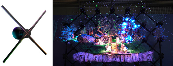 投影装置「HYPERVSN 3D holographic device」(直径56cmと75cmの2サイズ)1台で、インパクトのある立体映像を表示できる。さらに、この投影装置を複数台連動させることで迫力・臨場感のある大型の立体映像を実現し、視聴者に非常に強い印象を与えることが可能。HYPERVSNの立体映像は、独自技術によって高輝度でHDレベルの高精細画質を実現している。