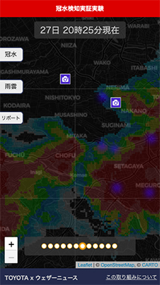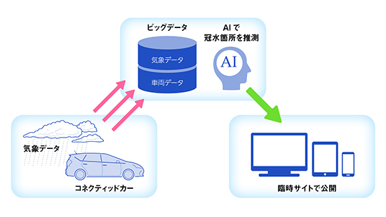 両社は今夏、車両データと気象データを学習させた冠水検知のAIアルゴリズムを開発。冠水しているエリアを車両が通過するとき、非冠水エリアと比べてアクセル踏み込み量に対する車両の速度が小さくなることを利用して、車両が通過した道路が冠水しているかどうかを判定する。一方、ウェザーニューズは、降雨実績データや同社のアプリ「ウェザーニュース」のユーザーから寄せられる天気報告であるウェザーリポートデータの提供を行い、アルゴリズムの作成、精度向上をトヨタと共同で行った。