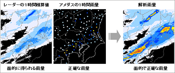 そのため地上雨量とレーダ雨量のデータを合わせて、広範囲かつ正確な雨量を解析雨量として算出してきた。しかし解析雨量は、30分おきに過去1時間の雨量から算出されるため、速報性に欠け、ダム流入水量に誤差が生じることがある。