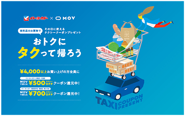 具体的にはイトーヨーカドーの大森店/木場店/溝ノ口店/鶴見店/横浜別所店の5店舗で、1回の会計で4000円以上購入し、イトーヨーカドーアプリの提示、もしくはセブンカードで支払い・提示した顧客を対象に、「MOV」で利用できるタクシー料金割引クーポンを配布する。実施期間と配布するクーポン金額は、大森店、木場店が10月17日~11月10日で500円分、溝ノ口店/鶴見店/横浜別所店が10月17日~11月16日で700円分。
