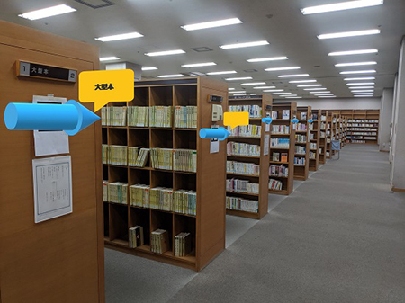 来館者は、スマートフォンやタブレット端末のカメラをかざすと現実空間上に矢印が表示され、この矢印で来館者を目的の書架まで誘導する。GPSの信号の受信が難しかった屋内でのナビゲーションがARを活用することで可能となる。