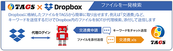 今回のサービスは、TAGSとDropbox BusinessをBOT連携することで、秘書感覚でチャットを使って業務のアシスタントを行う。TAGSにキーワードを入力し送信するだけで、Dropbox Businessに格納された関連ファイルを即座に返信する。例えば、Dropboxに各種申請書を格納している場合、「交通費」とチャットすると、交通費の申請書ファイルなどを即座に返信する。