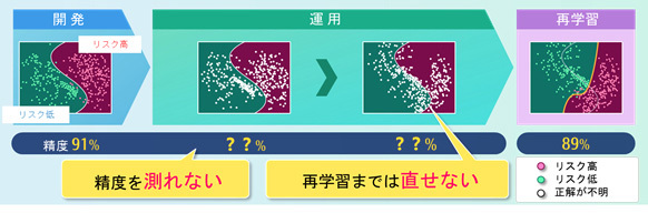 AIモデルの精度を確認するには、最新の入力データとセットとなる正解データが必要だが、正解データを準備するには、大量のデータに対して専門家が正解付けを行うことが必要となり、多大な作業がコストがかかる。また、人手による調査によって精度低下が確認できるまでは、再学習が必要となるタイミングを見極めることは難しく、精度が大幅に低下した時でもそのことに気づけないケースもある。