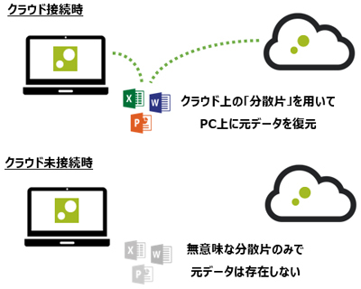 ZENMU Virtual Desktopは、独自の秘密分散テクノロジーにより、PC上に仮想ドライブを作成し、仮想ドライブ内のデータをPCとクラウド上に分散管理するソリューション。盗難や紛失に気付いた時点で、本人や管理者がクラウド上の分散片へのアクセスを停止することで、ユーザーデータを物理的に復元することができなくなるため、PCからの情報漏えいリスクを最小限に抑止できる。
