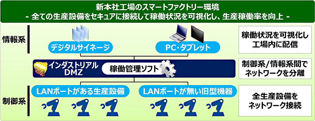 セキュリティ面では、制御系ネットワークと情報系ネットワークとの間にファイアウォール「Cisco ASAシリーズ」を設置してインダストリアルDMZ(産業環境向け緩衝エリア)を設けることで、生産設備の稼働管理以外の不要な通信を遮断している。これによって、外部からのサイバー攻撃を防ぐとともに、万が一のマルウェア感染時にも感染拡大エリアを抑える仕組みにした。