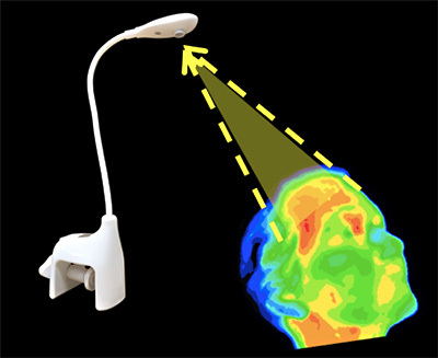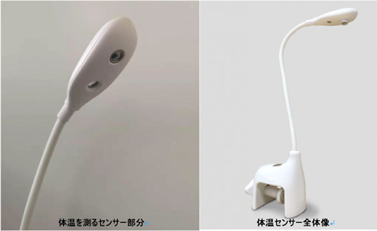 IoT体温センサー(仮)は前額部の上部に30~40cm離してセンサー部分がくるように設置し、非接触型で寝ながらリアルタイムに体温を測定する。本体の中央部にある液晶に測定した体温が表示され、本体単体で体温を測定できる。