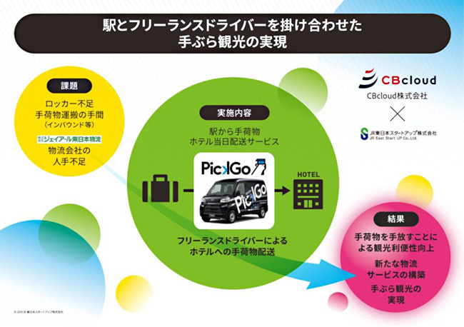 今回の実験では東京駅の手荷物預かり所に、CBcloudのフリーランスドライバーと荷主を即時につなぐ配送マッチングプラットフォーム「PickGo(ピックゴー)」を導入する。PickGoは、1万5000人以上のフリーランスドライバーが登録しており、荷主とドライバーを直接つなぐことでコストを抑え、配送にかかる時間を短縮することができる。