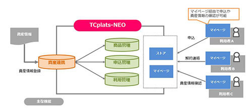 TCplats-NEOは、今年2月に提供したサブスクリプションビジネスを支える統合プラットフォーム「TCplats」のエントリーモデルで、資産管理を起点に管理者と利用者がストア、マイページを通じてつながり、資産の利用申し込みや解約、管理状況の確認などが可能となるSaaS型クラウドサービス。グループ企業間、同一企業内、フランチャイズ展開している取引先との資産管理、資産を大量に一括販売する際のメーカー・販売会社の販売支援など、さまざまな場面での活用を想定している。