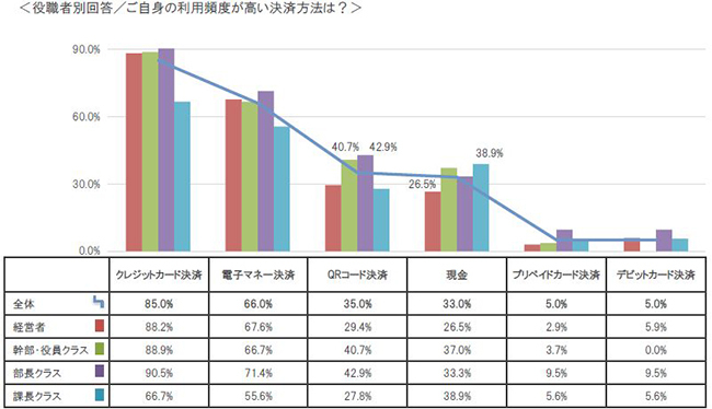 一方、課長クラスはクレジットカード決済が66.7%、電子マネー決済が55.6%、QRコード決済27.8%とほかの役職よりも低く、現金が38.9%とほかの役職よりも多かった。