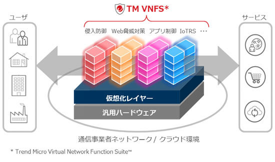 顧客が安心・安全にサービスを利用できるよう、ネットワークレベルでのセキュリティ脅威対策・通信の可視化など、効果的に高セキュリティ化を実現するため、トレンドマイクロが提供するNFV/クラウド向けネットワークセキュリティソリューション「Trend Micro Virtual Network Function Suite」(TM VNFS)と連携する。