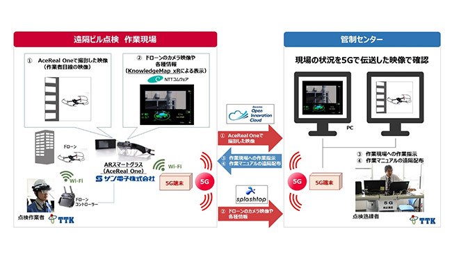今回の実証実験では、TTKのドローンを活用したビル外壁点検で、ドコモの5Gを活用し、サン電子のARスマートグラス「AceReal One」、NTT コムウェアのドローン情報取得・表示ソフトウェア「KnowledgeMap xR」、スプラッシュトップのクラウド型リモートデスクトップサービス「Splashtop」を組み合わせる。それにより、作業現場のドローンカメラ映像や各種飛行データ、ドローンを操縦する点検作業者視点からの映像を遠隔地の管制センターへリアルタイム送信し、それらの情報を基に管制センターから作業現場への指示や各種マニュアルのAceReal One画面上への表示を実施した。