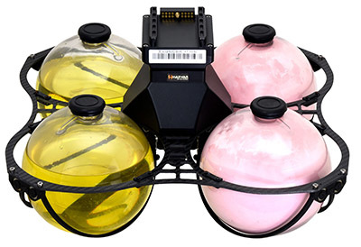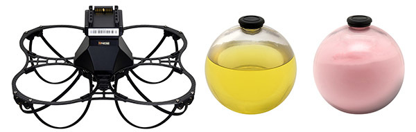 火災の見張り番・消火剤投下モジュールにFPVカメラを搭載し、リアルタイムで火災現場の状況を把握できる。また4個の消火剤を装着し、別々に火元に投下することができる。