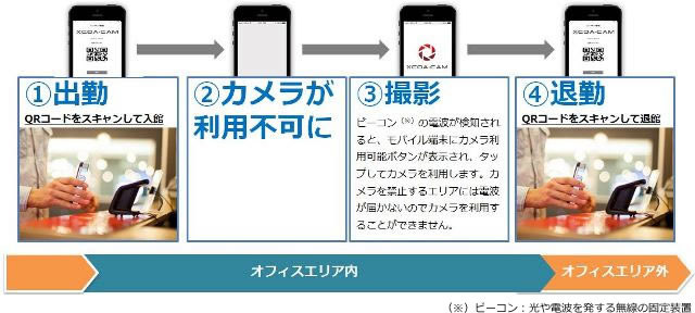 行員は、あらかじめ登録したモバイル端末に表示したQRコードをスキャンしてオフィスに入館すると、モバイル端末のカメラ機能が停止する。さらに、オフィス内でのQR決済の利用などを想定し、エリア内に設置されたビーコンの半径10~15メートルの範囲でのみカメラ機能を有効化し、それ以外の執務室で機密情報などを撮影できないようにする。退館時は入館同様、QRコードをスキャンすると制限が解除される。