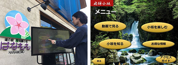 具体的には道の駅・南飛騨小坂はなもも(ビジターセンター)にデジタルサイネージ「KDDI Touchサイネージ」を導入する。観光地や観光施設を静止画、動画を用いて紹介し、下呂市内の周遊を図る。また、一部の宿泊施設のタブレットで、デジタルサイネージと同様のコンテンツを利用できるようにする。
