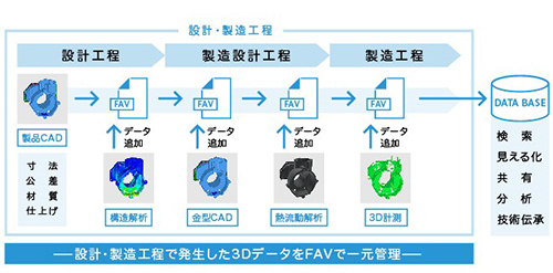 富士ゼロックスは、製造業でFAVを活用したモノづくり工程の新たな仕組みを構築。各工程で発生する3Dデータの一元管理を実現した。例えば、CADで作成した「形状データ」、商品の強度を示す「構造解析データ」、金型製造時に利用する「熱流動解析データ」、商品が設計通りの寸法や形状でできているかを確認するための「3D計測データ」など、モノづくりに必要なさまざまなフォーマットの異なる3DデータをFAV仕様に変換し、統合することができた。