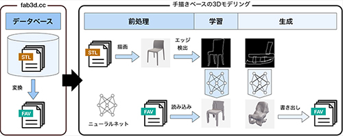一方、慶應義塾大学ではFAVで記述された大量の3DデータをベースにAIを活用することで、簡単な平面の手書き図から3Dデータを自動生成する技術を構築した。慶應義塾大学が運営する3Dデータの検索エンジンであるfab3d.ccでは、もともと60万点を超えるSTL(メッシュ形式)ファイルを蓄積していたが、今回、この中で適切なライセンスが付与されている約30万点をボクセル形式のFAVファイルに変換し、AIにおけるビッグデータとして活用した。
