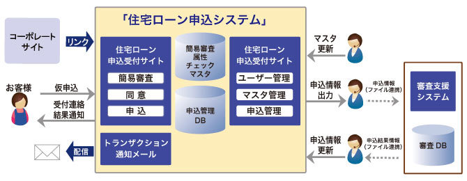 ローン申込Web受付システムは、個人顧客がパソコン・スマホなどからウェブ経由で住宅ローンの事前申し込みを可能にするシステム。来店が不要でいつでもどこからでも申し込みが可能なことから顧客の利便性が向上するほか、ペーパレス化も推進できる。