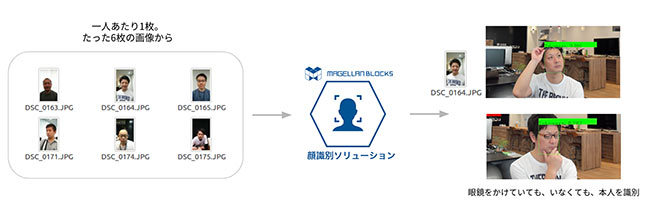 学習用データの量や質に依存することなく、少ない画像データからでも高精度に人の顔を識別できるこの技術を「MAGELLAN BLOCKS」の標準機能として搭載。見分けたい画像の学習から特定までを一気通貫で実現する新たなモジュール顔識別ソリューションとして提供する。