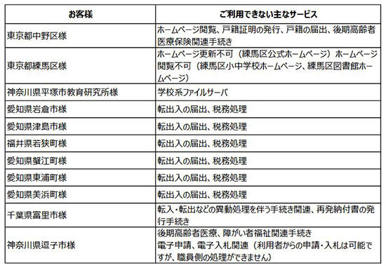 今回のシステム障害は、12月4日の10時56分頃から発生。Jip-Base上で稼働している業務システムの一部が利用できないなどの支障が出ている。障害が発生している自治体は東京都中野区、練馬区、神奈川県逗子市など約50自治体。住民向けのウェブサイトが閲覧できない、住民票や印鑑登録証明など各種証明書の発行、戸籍の届け出、後期高齢者、医療保険関連手続きなどに支障が出ている。