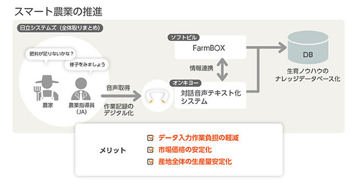 今回の実証実験は、日立システムズが企画から実施、課題抽出などの取りまとめを担当し、ソフトビルが農業向けに特化して開発した業務改善プラットフォーム「FarmBOX」と、オンキヨーが開発したハンズフリーのネックスピーカー型デバイスを含む「対話音声テキスト化システム」を活用して実施する。