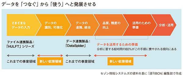 とりわけデータ分析に要する時間の約8割が、データの形式の不揃いや重複を補う準備作業に費やされる傾向にあり、この部分をできる限り自動化、省力化することが「早く、品質よく、効率的なデータ分析に欠かせない」(野間英徳・HULFT事業部マーケティング部部長)と指摘。セゾン情報システムズでは、データの取得から統合、分析にかけられるようにするデータ整備の一連の工程をパッケージとして提供することで、個別SIで開発するより、格段に安く、早く実現できるようにしていく。HULFTやDataSpiderを中核とするデータマネジメントソリューションによって、データを活用できる段階まで持っていくとともに、外部の優れたデータ分析、活用のパッケージソフト、SaaS型サービスと連携させる。同社では、これを他社と連携するビジネスという文脈で「リンケージ・ビジネス」と呼ぶ。