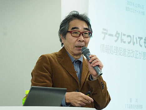 基調講演で登壇したのは、IT記者会の佃均代表理事。「データ活用について、もう一度考える 情報処理促進法改正が意味するもの」と題し講演を行った。