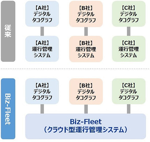 デジタコメーカーが提供する従来の運行管理システムには互換性がなかったため、運送事業者にとっては、一度デジタコを導入すると、優れた機能が搭載された別メーカーのデジタコが発売されても変更を行うことが難しい状況にあった。今回、SGシステムが「マルチベンダ・マルチデバイス」をコンセプトに開発したBiz-Fleetは、複数メーカーのデジタコと連携可能で、1つのシステムでさまざまなメーカーのデジタコデータを管理することが可能となる。