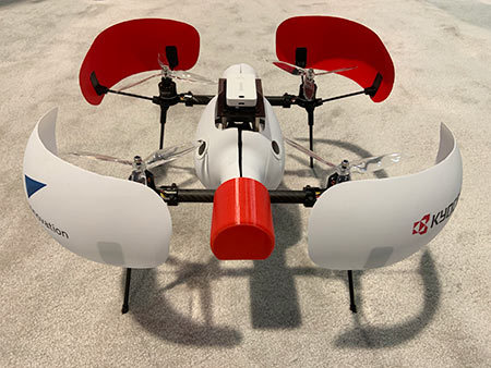 移動通信中継局は、災害現場などの携帯電話の電波が届かないエリアで、通信中継局機能をもつ複数のドローンを飛行させることで、平常時と同じように携帯電話での通信を可能にするもの。ドローン内の通信ユニットが通信エリアを判断し、自動で通信網を形成することができる。