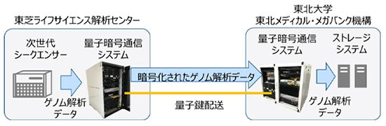東芝とToMMoは、この技術を活用し、東芝ライフサイエンス解析センター(仙台市青葉区南吉成)に設置した次世代シークエンサーを用いて、ToMMo(仙台市青葉区星陵町)までの約7km間に敷設された光ファイバー専用回線を介したデータの伝送実証を行った。ToMMoが保有するDNA検体を対象とした、全ゲノム配列解析から出力される全ゲノム配列データを、量子暗号通信によって逐次暗号化・逐次伝送させ、解析処理完了から遅延なく、リアルタイム伝送することができた。これにより、量子暗号技術が、大規模で秘匿性の高いゲノム解析データの暗号伝送に十分に活用でき、実用レベルであることを確認した。