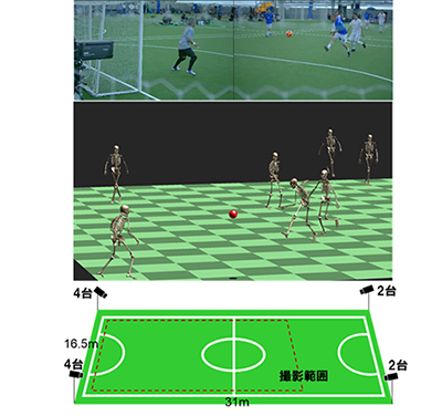 今回の技術は、解析に用いるべき最適な映像を、複数のカメラから自動的に選択して切り替えることで、広い空間での複数人のモーションキャプチャーを行う。また、人同士の身体が映像上で重なって見える状況下でも、人の骨格構造と運動の連続性、そして最新の画像認識技術を活用することによって頑強に運動を推定することができ、フットサルのように複数の選手が激しく動き回るようなシーンでも、高精度で滑らかなモーションデータや骨の動きが取得できることを実証した。