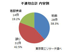 19年に不適切会計を開示した70社では、東証1部が49社(構成比70.0%)と7割を占めた。内容別では、最多が経理や会計処理ミスなどの「誤り」で31件(同42.5%)。次いで、子会社で不適切会計処理などの「粉飾」が28件(同38.3%)だった。産業別では、最多が「製造業」の30社(同42.9%)。次いで、サービス業の11社(同15.7%)と続いた。