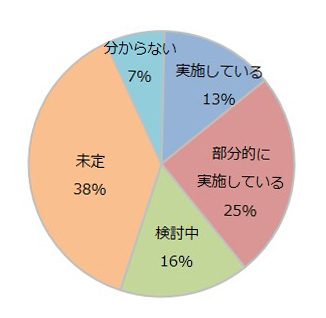 働き方改革の実態では、「働き方改革を実施/部分的に実施している」が38%、「実施していない」が半数以上(53%)にのぼり、中小企業での働き方改革には大きな遅れが出ていることが分かった。具体的に導入している働き方改革は、「有給休暇取得の促進」が67%、「時間外労働の是正」が47%という結果だった。