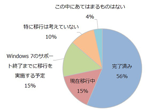 Windows 10への移行を完了しているのは、わずか56%、現在移行中(15%)を含めても71%という結果に。一方、移行に未着手だとの回答者が約25%にのぼり、1月のWindows 7サポート終了時点で、中小企業のWindows 10への移行に遅れが出ている状況が明らかになった。また、「とくに移行を考えていない」と答えた回答者に理由を聞いたところ、56%が「必要性を感じていない」と回答しており、セキュリティ面での知識不足がうかがえる結果となった。
