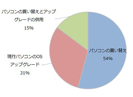 Windows 10への移行方法についての質問には、54%が「パソコンの買い替え」と回答。「OSのアップグレートとパソコンの買い替えの併用」を含めると、69%が移行に際して、パソコンを買い替えていることが判明した。