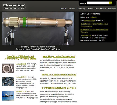 QuesTekは、コンピューターテクノロジーによるマルチスケールで統合的なシミュレーションで材料開発を行うICME(Integrated Computational Materials Engineering)技術の先駆者である米マサチューセッツ工科大学のProf.Greg Olson氏によって設立された。ICME技術とQuesTek独自の材料特性データベース、モデル、特性評価ツールなどを組み合わせて材料を設計するMaterials by Designという独自の手法で、耐久性の高い鉄鋼やアルミニウム、チタン、銅、ニッケル、コバルトなどをベースとした新しい合金を開発している。