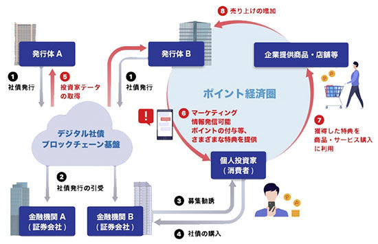 みずほFGなどは、新たなシステム基盤のプロトタイプを構築した。このシステム基盤を活用して社債を発行することで、小口、小額で個人向け社債のオンライン販売ができるほか、発行体と投資家が直接接点を持ったり、個人投資家にポイントの付与などの特典を提供したりすることができるとしている。