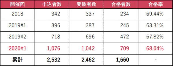今回は2月21、22の両日に実施した。1076人の申込者のうち1042人が受験し、709人が合格した。合格率は68.04%。受験者数が1000人を突破したのは初めて。累計合格者数は1660人となった。