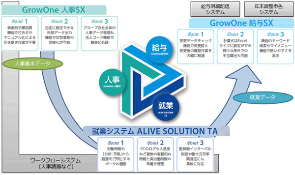 近年、働き方改革を推進するために過重労働の抑止や多様な勤務形態の導入・人事制度や賃金体系の見直しなど新たな社内制度を取り入れる企業が増えている。これを受け今回、人事管理システム「GrowOne 人事SX」、給与計算システム「GrowOne 給与SX」を提供するニッセイコムと、就業システム「ALIVE SOLUTION TA」を提供する三菱電機ビジネスシステムは、両システムの連携を強化する。