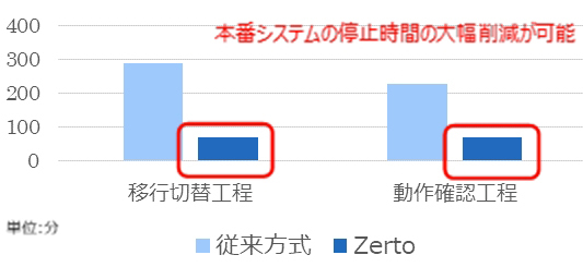 また、Zertoの仮想化機能により、現行システムを稼働させたまま、事前に移行後のシステムの稼働確認をシミュレーションすることが可能。移行プロジェクトの確実性を大幅に向上する。