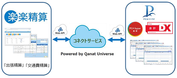 通常、クラウドサービス間でAPI連携するためには、事前にデータをマッチングする設定やAPIトークンの発行作業など諸々の作業が必要となるが、ケーイーシー(PCAの100%子会社)が提供する「コネクトサービス for PCA 会計・楽楽精算」により、連携設定や運用サポートサービスをサブスクリプション型の年額サービスとして提供できるようになった。なお、クラウドサービス間をAPIで接続する基盤サービスとして、JBアドバンスト・テクノロジー(藤岡 英二社長)の「Qanat Universe」を利用している。