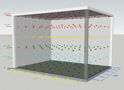 VR消防教育訓練システムの開発にあたっては、建物室内を実際に燃焼させて火災を再現し、温度を基軸とした熱の分布、煙の移動、火炎の挙動などを測定する。これにより、時間経過とともに推移していく火災現象を正確に捉えながら、消火活動との相互作用も含めて再現していく。