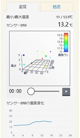 一般的なグラフ表示だけでなく、多地点で測定された同一時間帯の温度を1度ごとに色付けして、3Dマップ上に表示する。農作物は1度の差で成長に大きく影響するが、各時間帯の温度・飽差のムラをわかりやすく可視化することで、収量差の出やすい温度ムラ箇所の具体的な制御改善を行うことができ、収穫量の増加・品質の安定化につながる。さらに、オプションを利用することで、複数のハウス間の環境比較や任意のセンサー間の環境比較など、より詳細な分析を簡単に行うことができる。