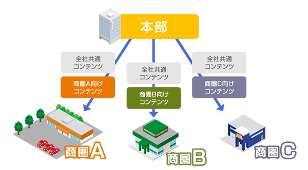 アロービジョンは、オンラインでコンテンツ更新やスケジュール調整が可能なため、本部で一括管理することができる。自社でのコンテンツ制作や運用が可能で、業者に都度依頼する必要もない。また、通常サイネージサービスは1台あたりの価格設定が多く、台数を増加するごとに月々の運用費負担が増加するが、「アロービジョン」は1店舗あたりの価格設定のため、とくにジョイフル本田のように広大な店舗の場合、コストメリットがさらに高くなる。