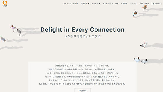 アディッシュグループは、同社と連結子会社2社(アディッシュプラス、adish International Corporation)で構成され、「つながりを常によろこびに(Delight in Every Connection)」というミッションのもと、ソーシャルメディアやコミュニケーションサービスなどを介して人と人がつながるからこそ起きる課題を解決し、利用者にとって健全で心地よい“居場所”をつくることを目的としたカスタマーリレーション事業を展開している。カスタマーリレーション事業の主なサービスは、「ソーシャルアプリサポート」「インターネットモニタリング」「スクールガーディアン」の3つとなる。