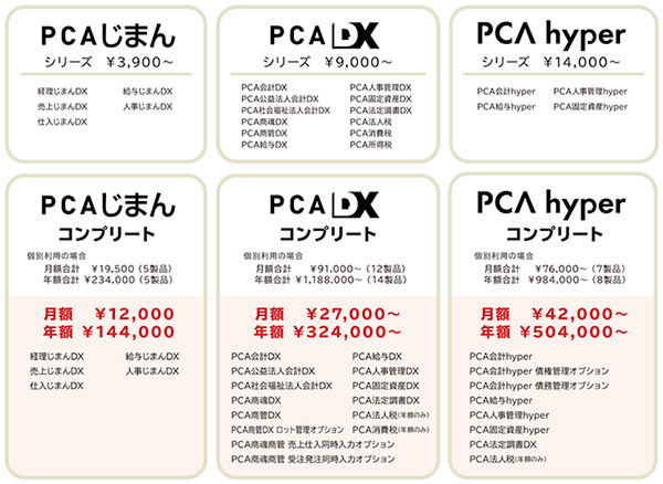 PCAサブスクでは、複数のPCAソフトがすべて使い放題になる「コンプリートモデル」をラインアップ。税別価格例は、「PCAじまんコンプリート」が月額1万2000円、年額14万4000円、「PCA DXコンプリート」が月額2万7000円から、年額32万4000円から、「PCA hyperコンプリート」が月額4万2000円から、年額50万4000円から。