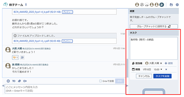 チャット以外にも便利な機能がある。タスク機能を使えば、担当者や期限を設定して、作業の進行具合を確認することが可能だ。チャットウインドウの隣に常に表示されているので、メッセージでやりとりしながら「これは進捗確認しておきたいな」と思ったら、すぐにタスクに追加できる。