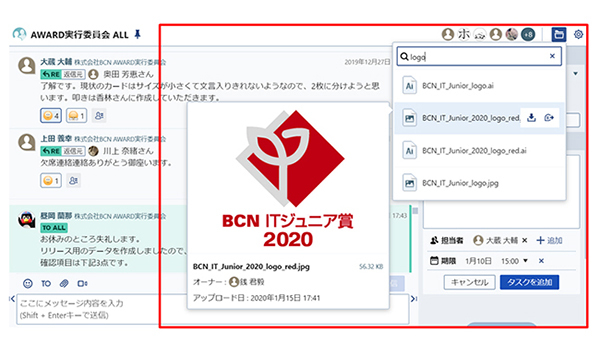 制作物のやりとりが多く、データ共有の機会がたびたびあったのだが、Chatworkではこれまでのコメントに添付したデータを一覧することもできる。ビューアーもついているので、目当てのデータを探し当てるのも簡単だ。メールでデータを共有していた時代は、それらしいキーワードを入力して手探りしていたので、かなり作業が効率化した。