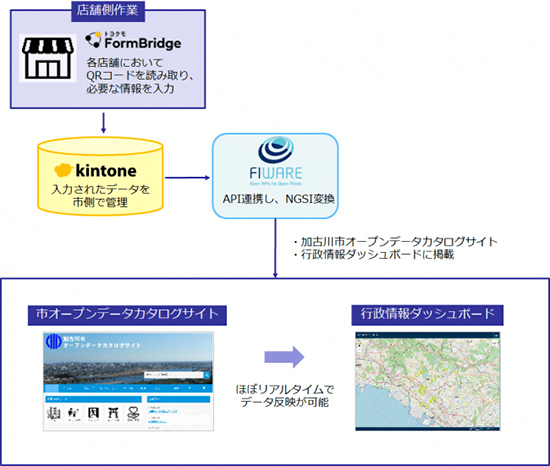 緊急の対策のため、市職員がオープンデータ用にデータベースを開発できるシステムとしてサイボウズの業務アプリ開発プラットフォーム「kintone」を採用。また、飲食店が自らスマートフォンで店の情報を入力できるよう加古川商工会議所が収集する方法に加えて、トヨクモのフォームブリッジを使ってkintoneにデータを送る仕組みを構築した。kintoneに蓄積された飲食店のデータは、フューチャーリンクネットワークによってオープンデータ化され、行政情報ダッシュボード上に自動で反映していく。